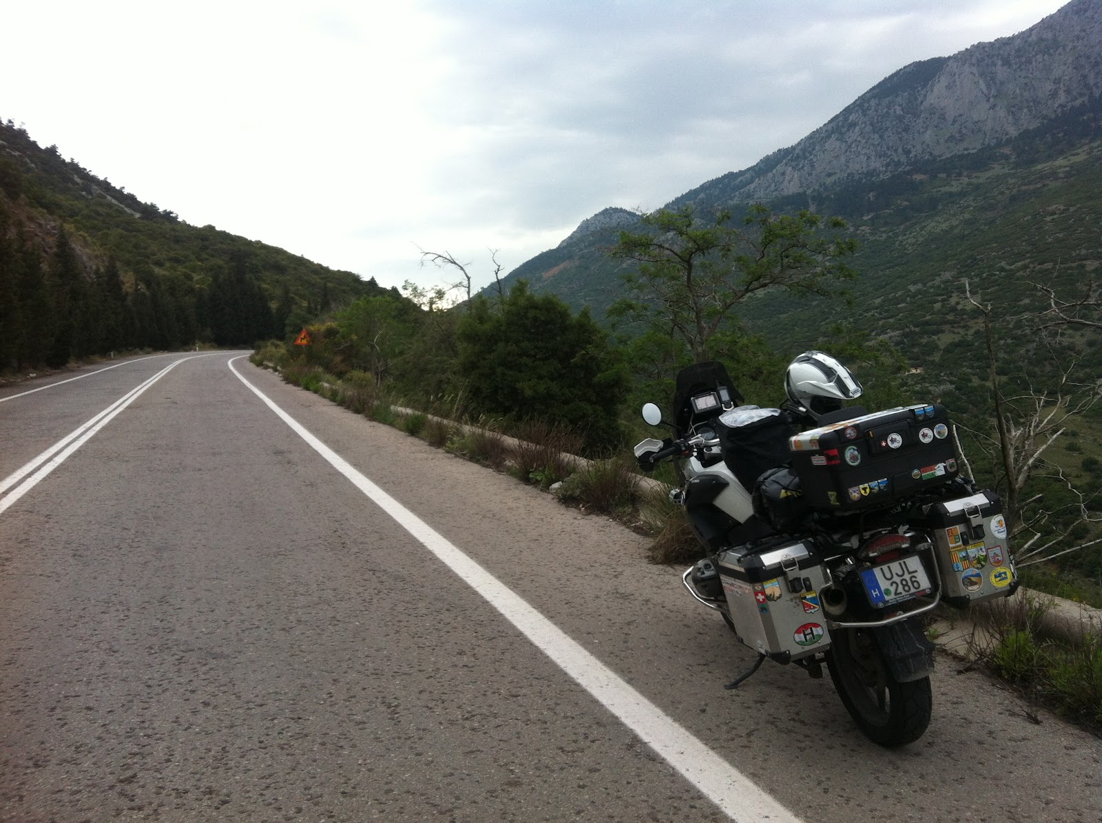 We parted company with Orestis in Athens and followed our GPS on the small roads towards the Northwest. It didn’t take long before we stopped for fuel and immediately put on our rain jackets as we looked at the sky. It turned to be a wise decision as it soon started raining. The roads were slippery so we couldn’t keep a good pace hence we didn’t stop until about 20 miles before Delphi.
